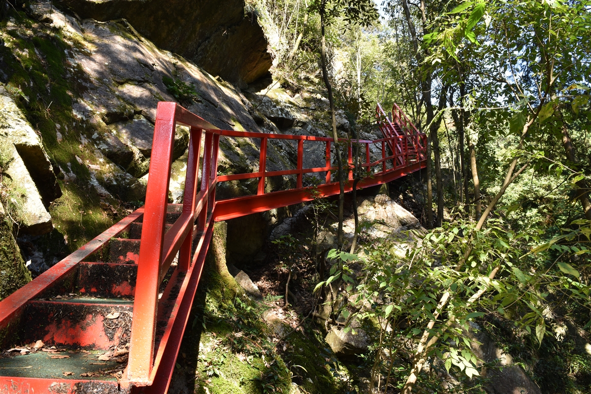 登山道を登って行くと3段の滝が一望できる展望台が設置されている。滝を跨ぐように架かる赤い橋から眺める風景は見ごたえがあります。