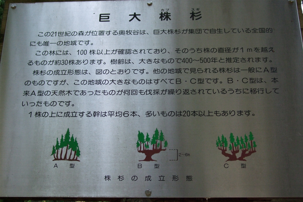 入り口にある案内看板を見ると、杉株の種類もいろいろなパターンがあることがわかる。