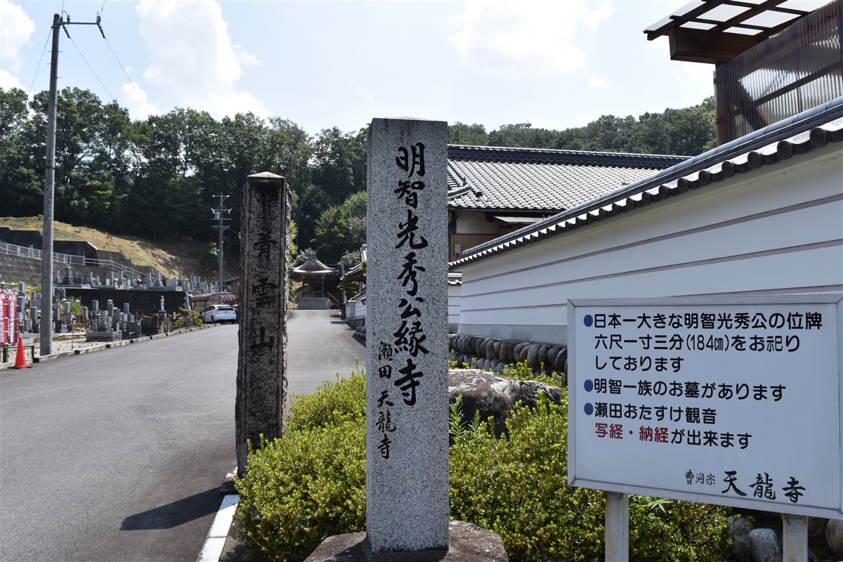 駐車場から少し歩いたところにある「天龍寺」には、明智光秀の位牌と明智家歴代の墓所があります。